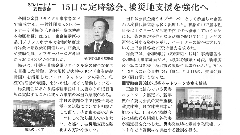 2024年2月15日に開催いたしました定期総会並びに災害協定締結式の概要が日刊市況通信に掲載されました。