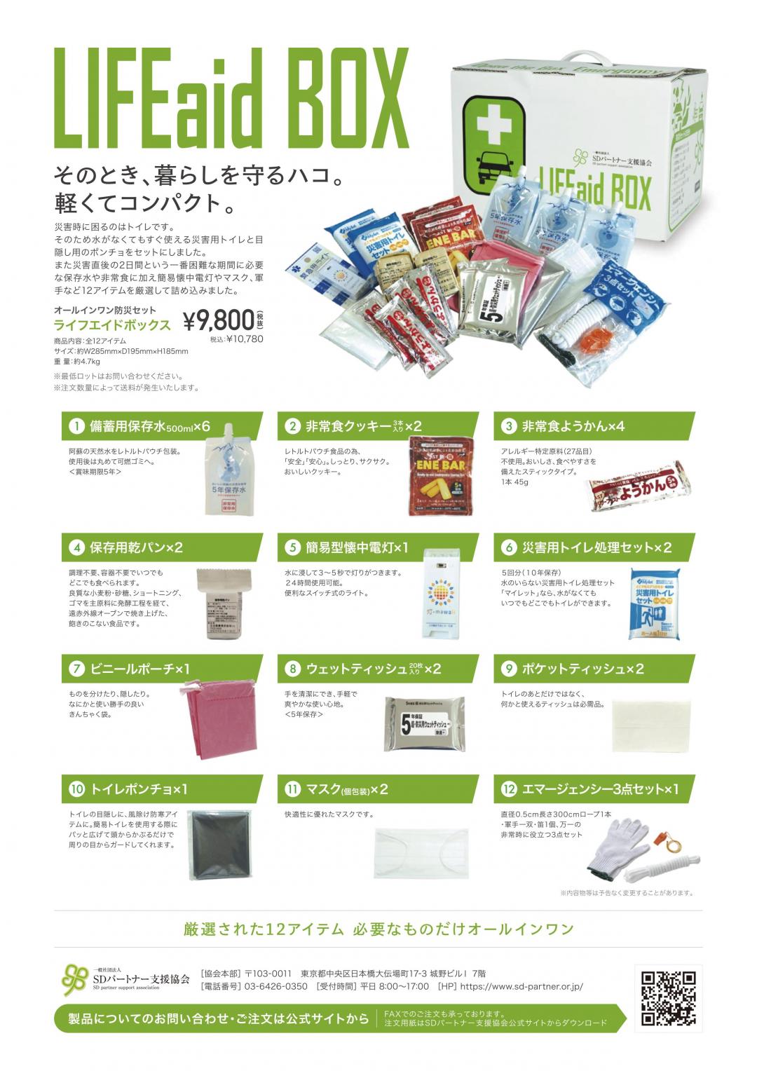 近年発生する豪雨災害や豪雪災害時に活躍する車載キット「LIFEaidBOX」の取り扱いを開始しました。このキットは車載が可能な備品を専用に選定していますので、車に積みっぱなしでもOK。車中泊などを余儀なくされた場合でも2日間はトイレ、食事、水分補給が可能なアイテムを選定しています。トラック輸送や遠出が多い方にはおススメです。